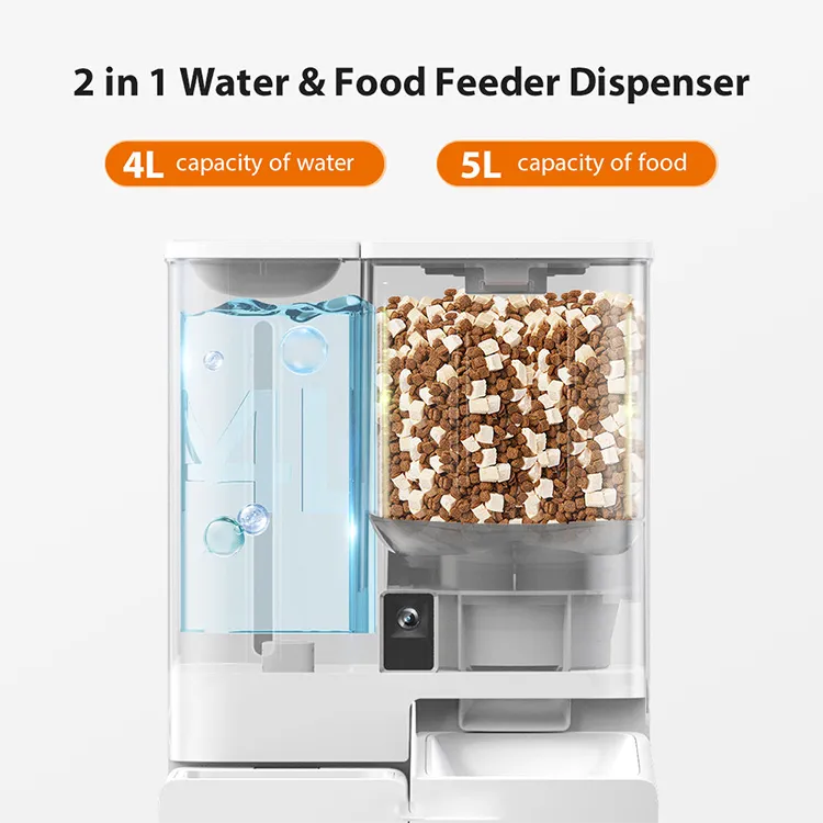All-in-One Convenience:Combines a 5L food dispenserand 4L water dispenserin one sleek unit, ensuring your pet has constant access to fresh food and water, simplifying your routine and saving space.