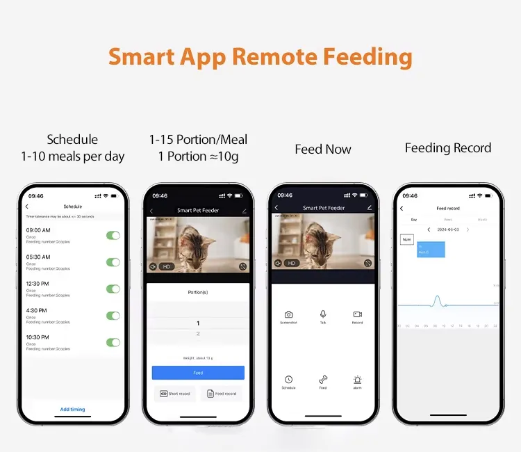 Smart App Control & Customization:Manage everything from your phone. Set custom feeding schedules, dispense extra meals instantly, review daily feeding records, and receive smart alerts for low food, potential blockages, or when the desiccant needs replacing.