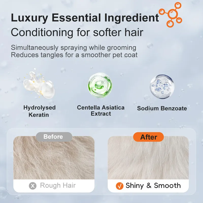 Soothing Mist + Essence Infusion: The built-in, atomized serum spray is a game-changer. It releases a fine mist of nourishing Hydrolyzed Keratin, Centella Asiatica Extract, and conditioning agents directly onto the coat as you brush. This instantly reduces static electricity and flying hairs, detangles knots gently, and delivers leave-in softening care for incredible shine and smoothness. No more discomfort, just a calming, spa-like experience.